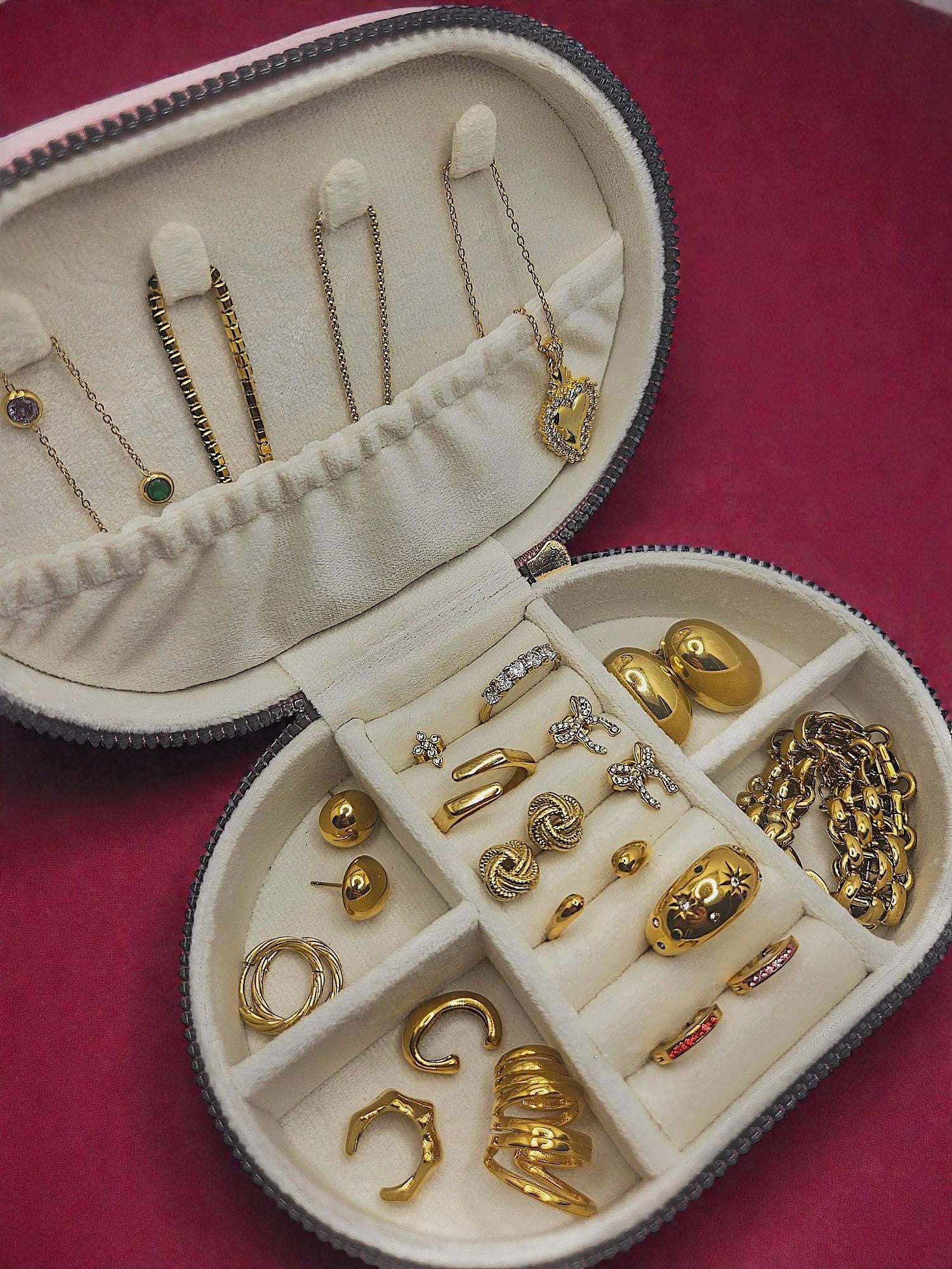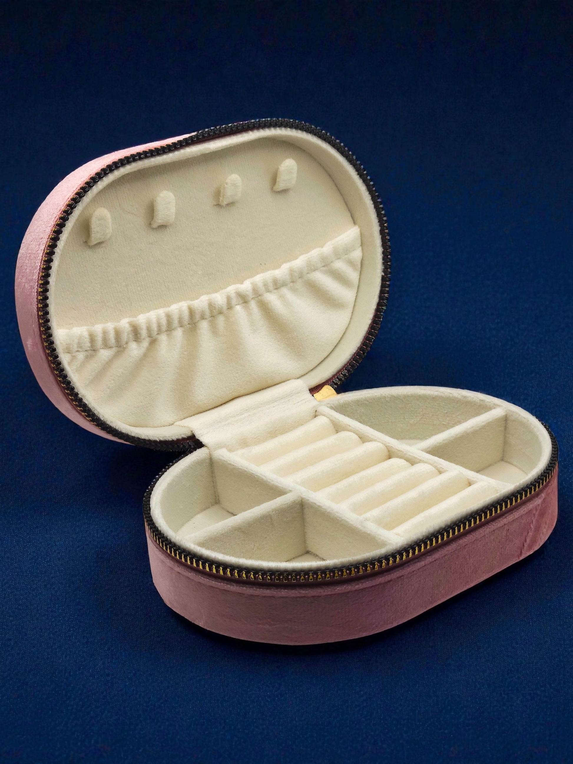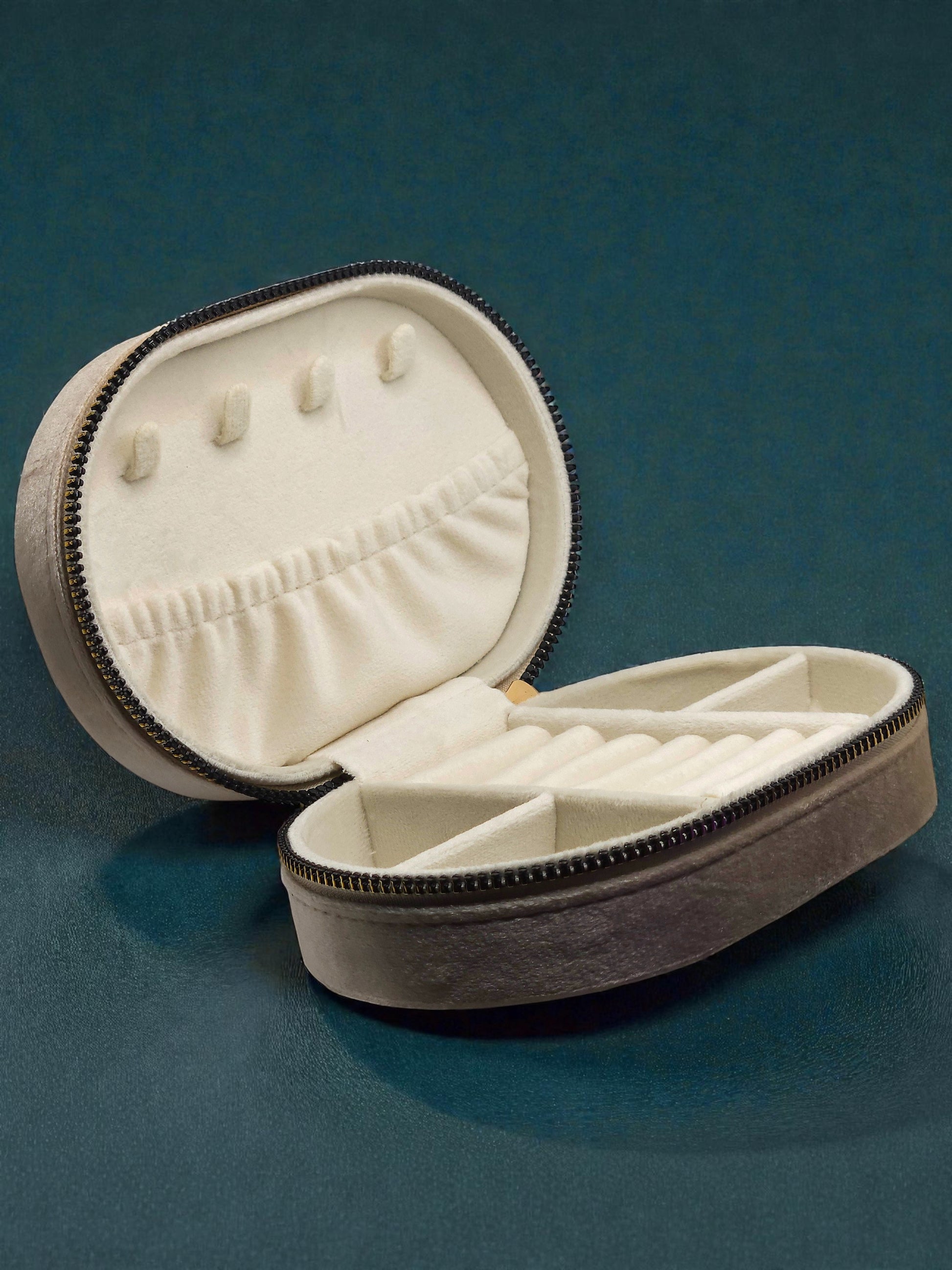 Rivestito in un morbido velluto che cattura la luce, questo portagioie compatto è pensato per accompagnarti ovunque: in viaggio, in borsa o semplicemente sul tuo comodino.